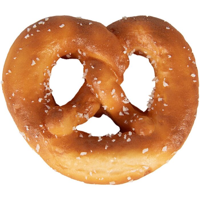 Dekoracyjny plastikowy precel o realistycznym wyglądzie, rozmiar 10x9x2 cm, brązowy z solnymi detalami, idealny do gablot, półek lub stołów jadalnych