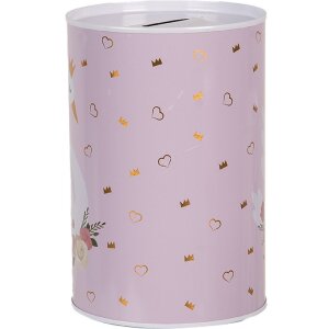 Metalowa skarbonka, Ø 10x15 cm, romantyczny design z motywem łabędzia, różowa z białymi i złotymi akcentami, idealna do dekoracji lub jako prezent