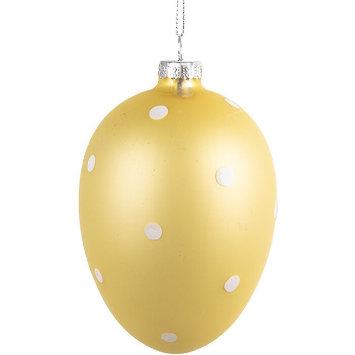 Czarujące jajko dekoracyjne Clayre & Eef, żółte z białymi kropkami, rozmiar Ø 8x12 cm, wykonane ze szkła, w stylu wiejskiego domu, idealne jako dekoracja wisząca.