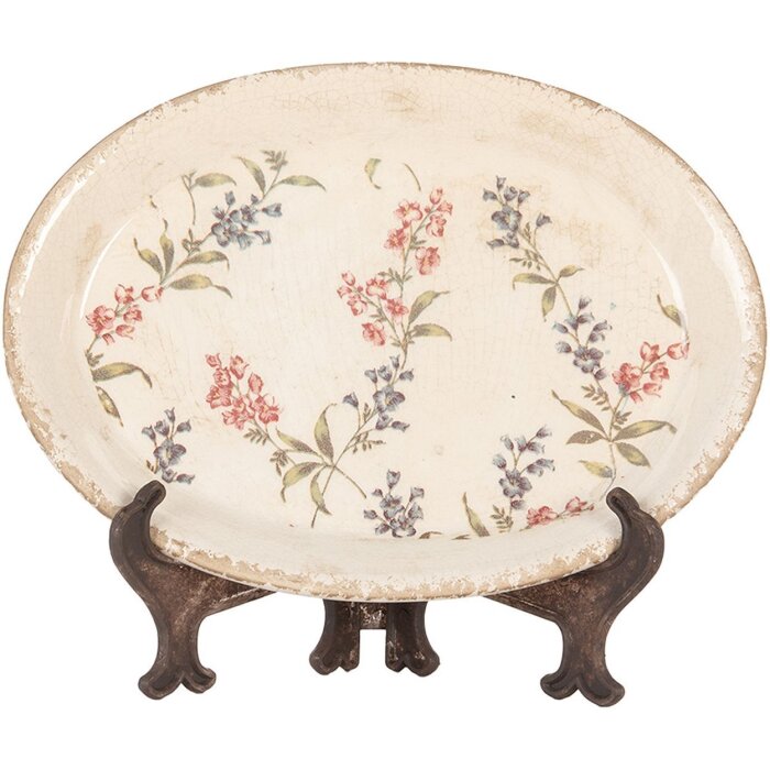 Talerz dekoracyjny Clayre & Eef, nostalgiczny styl, wysokiej jakości ceramika, delikatny kwiatowy wzór, beżowo-różowy, 25 x 18 x 3 cm, idealny do dekoracji i prezentacji