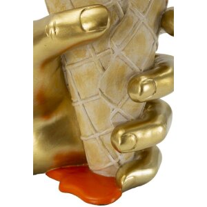 Doniczka z polyresynu, 18x16x26 cm, złoto-pomarańczowa, złota dłoń z lodami i polewą, dekoracyjny obiekt Pop-Art o wyrazistym charakterze