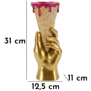 Doniczka z poliresynu, 12,5x11x31 cm, złoto-różowa, złota dłoń z lodami, kwieciste otwarcie, dekoracyjna w stylu pop-art.