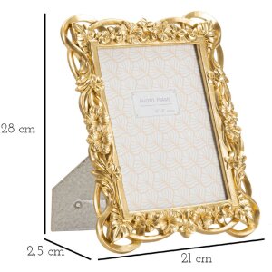 Ramka na zdjęcia 15x20 cm, wymiary całkowite 22,5x2,5x28 cm, polyresin & szkło, złota, kwiatowy wzór z kwiatami i liśćmi, może być umieszczona pionowo i poziomo, elegancka i wszechstronna dla stylowych wspomnień.
