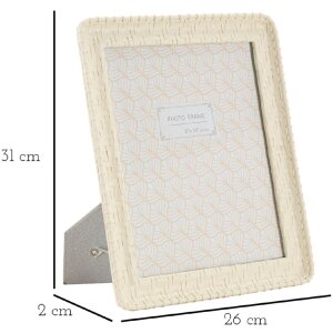 Ramka na zdjęcia 20x25 cm, wymiary całkowite 26x2x31 cm, żywica poliestrowa i szkło, kremowa, wygląd bambusa z delikatnym wzorem wikliny, może być ustawiona pionowo i poziomo, naturalna i stylowa dla subtelnych akcentów w domu
