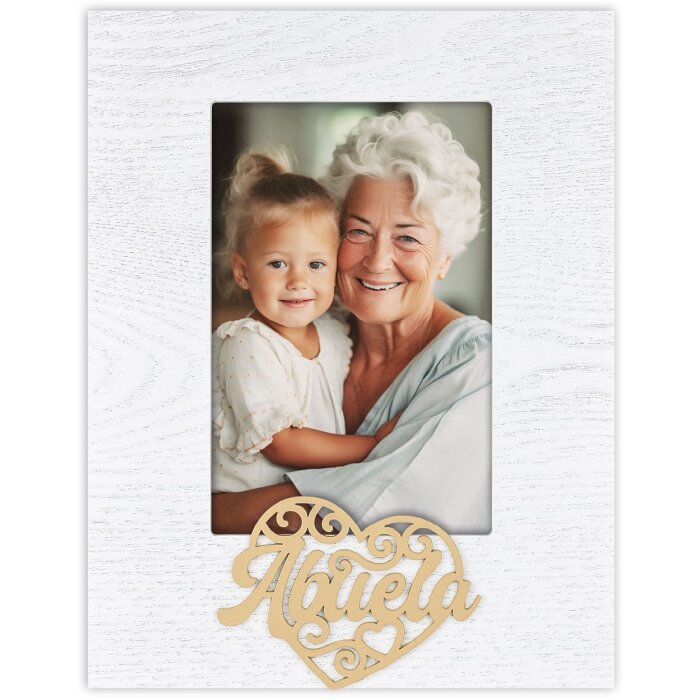 Drewniana ramka portretowa ZEP Aida, 10x15 cm, format portretowy, stojąca, biała, napis "Abuela" w kształcie serca, hiszpańska